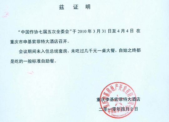 中國(guó)作協(xié)鄭重聲明:在重慶召開的中國(guó)作協(xié)七屆九次主席團(tuán)會(huì)和七屆五次全委會(huì),沒有任何與會(huì)人員入住總統(tǒng)套房;沒有安排所謂2000多元一桌的宴席,全體與會(huì)人員用的是酒店平日標(biāo)準(zhǔn)的自助餐。會(huì)議期間,組織與會(huì)人員參觀渣滓洞集中營(yíng)舊址、“打黑除惡”資料展覽和到重慶烈士陵園祭奠掃墓等活動(dòng),都是集體乘坐大巴、中巴車往返。