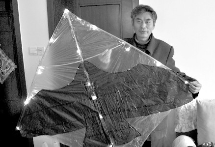 昨日下午2時(shí)許,在東坡路靠近清水河的一塊空地上,一只黑色的風(fēng)箏正在天空中翱翔。在不遠(yuǎn)處,一位身著黑衣的白發(fā)老人正拿著絞盤,不斷地放線收線,其他幾位老人則抬著頭議論紛紛。放風(fēng)箏的老人名叫戚勉休,今年69歲,而他就是前晚放飛發(fā)光風(fēng)箏的人。