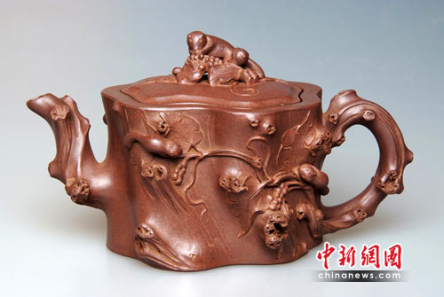 宜興紫砂與“世博”淵源頗深,歷史上曾多次參加世界性博覽會(huì)并獲大獎(jiǎng)。記者現(xiàn)場(chǎng)看到,在歷屆國際性展覽中獲獎(jiǎng)的6件珍品在展廳內(nèi)光彩耀目,其中在1910年“第一次南洋勸業(yè)會(huì)”上獲金獎(jiǎng)的范大生“大柿子壺”、1915年美國巴拿馬國際賽會(huì)獲金獎(jiǎng)的程壽珍“掇球壺”、1926年美國費(fèi)城藝術(shù)博覽會(huì)獲金質(zhì)獎(jiǎng)的馮桂林“松鼠葡萄壺”等珍品引來眾多文化藝術(shù)界人士爭相一睹芳容。
