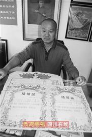 “這張海報有人出價萬元,我都不舍得賣。”昨日上午10時許,見有人來訪,50歲的李杰拿出自己最愛的寶貝——一張梅蘭芳宣傳畫,這是新中國成立前印制的。宣傳畫上,京劇大師梅蘭芳面帶微笑,依靠在一張沙發(fā)上,宣傳畫的題詞為郭沫若!靶∥輭Ρ谏,都是精選出來的。在我家的保險柜里還有近千幅海報,各種各樣的都有。”李杰說。
