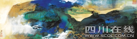 《愛痕湖》為張大千1968年所作巨幅絹本潑彩,寬76.2厘米,長264.2厘米,畫面描繪的是遠(yuǎn)眺瑞士亞琛湖所見,與張大千平生巨構(gòu)《長江萬里圖》創(chuàng)作于同年,為張大千《愛痕湖》系列中最精彩、尺寸最大的一幅。該作品于20世紀(jì)60年代曾獲展于紐約、波士頓、芝加哥等地的著名畫廊,2003年又獲展于紐約大都會博物館《兩種文化之間》大型中國現(xiàn)代藝術(shù)展,是藝術(shù)史界共認(rèn)的張大千潑彩山水最精彩的作品。畫面前景為青翠的山巒,后景則一泓湖水,掩映其間,又有淡墨、淡彩勾勒的屋舍。這是張大千化用西方抽象派藝術(shù)與中國傳統(tǒng)文人藝術(shù)的水乳交融之作,也是以現(xiàn)代的語言,對北宋雄偉山水的現(xiàn)代性翻譯,不僅是張大千的藝術(shù)臻于化境的象征,也是中國傳統(tǒng)藝術(shù)最成功的“現(xiàn)代性突圍”。