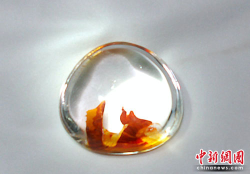 全國(guó)30多個(gè)單位的參展商帶來的珍品將整個(gè)展館擺放的滿滿當(dāng)當(dāng)。當(dāng)記者來到水晶展柜前時(shí),來自西安的張老板拿出了自己收藏了十多年的天然水晶“王者之鳳”。據(jù)他介紹,天然水晶是水受到擠壓后形成冰膜,吸取地下的氧化亞鐵和鎂元素后形成的。“王者之鳳”原產(chǎn)地為巴西,圖為一只頭戴王冠的鳳凰昂首挺胸站在山頂上,鳳尾向下飄垂,紅黃兩色代表著吉祥喜慶,極其罕見。