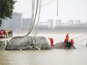 4股共8根白色的“繩子”從空中吊臂上垂下,已經(jīng)將一塊露出水面最多的不規(guī)則疑似巨石牢牢“網(wǎng)”住!坝率俊碧(hào)打撈船現(xiàn)場(chǎng)總指揮王雷告訴記者,打撈船自身重達(dá)萬(wàn)噸,這8根白色“繩子”應(yīng)該叫“高強(qiáng)度尼龍纜繩”,每根比一個(gè)成人的手臂都粗出許多,是由特殊材料定制的,造價(jià)不菲。“勇士”號(hào)上月28日進(jìn)入打撈水域后,就開(kāi)始馬不停蹄地為打撈做前期準(zhǔn)備,近50名專業(yè)打撈人員,輪換潛水進(jìn)入江底巨石所在位置,進(jìn)一步清淤后又用高壓設(shè)備沖泥,這樣將巨石臥江位置沖出一定空間。再將高強(qiáng)度尼龍纜繩穿過(guò)石體,到昨天才剛剛固定完畢。記者問(wèn)他,這些專業(yè)人士潛入江底,能否看到石塊上有字跡或其他古跡。王雷說(shuō),“潛下去后,水下的能見(jiàn)度為零”,同時(shí),因?yàn)閷I(yè)人士全身著特定的潛水打撈衣,手也無(wú)法感知。所有一切疑問(wèn)及待解之謎,看來(lái)只有留待巨石出水之時(shí)解開(kāi)了。