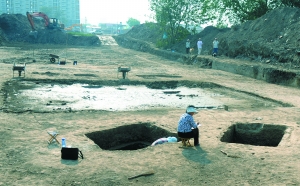 昨天下午,麗澤金融商務(wù)區(qū)內(nèi)的考古發(fā)掘工作仍在進(jìn)行中。建筑基址的發(fā)掘現(xiàn)場(chǎng)深3米多,表面上敞開著幾個(gè)坑穴,工作人員正在其附近“精耕細(xì)作”,將發(fā)掘出的文物逐一進(jìn)行清理。在一個(gè)敞開的墓葬內(nèi),可以清楚地看到墓主人的遺骸。