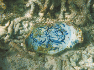 孟原召回憶,考古隊(duì)根據(jù)漁民提供線索發(fā)現(xiàn)該遺址,此遺址明顯經(jīng)漁民盜撈,表面散布圓形和不規(guī)則形盜坑,深約0.5-1米左右,為小艇螺旋槳吹打所致,海床翻動(dòng)較大,表面散落元代德化窯瓷器、景德鎮(zhèn)窯卵白釉瓷器和青花殘片,及龍泉窯青釉瓷器,遺物分布較密集,采集到的瓷器有青花、青瓷、白瓷、醬釉等,年代有元、明兩個(gè)時(shí)期。