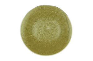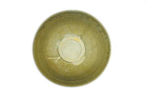 枇杷黃、釉色潤(rùn)、深腹、斂口、小圈足的小碗,碗口以下弧線內(nèi)收,器內(nèi)壁劃刻簡(jiǎn)筆花草間配“之”字形篦紋,器外通體劃刻折扇紋,這種特色的中國(guó)瓷應(yīng)“珠光”大師之名被譽(yù)為“珠光青瓷”,馳名世界。