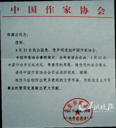 中國作協(xié)發(fā)給鄭淵潔的信中寫道:“5月11日,中國作協(xié)書記處決定,尊重您的意愿,接受您的退會要求。請將中國作家協(xié)會會員證退回我處。謝謝。祝您創(chuàng)作出更多更好的文學(xué)作品,為社會主義文學(xué)事業(yè)的繁榮發(fā)展做出更大貢獻”。信的簽章是“中國作家協(xié)會創(chuàng)聯(lián)部”,落款日期為6月4日。