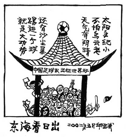 記者在采訪中同時(shí)了解到,華君武還是一位足球迷,2002年世界杯,中國(guó)隊(duì)出征韓國(guó)之前,他專門畫了一幅名叫《東海看日出》的漫畫。