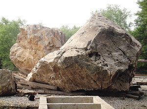 或許是巨石過于沉重,巨石下墊放的粗壯枕木有的都被壓斷,平臺(tái)面上還被砸出大小不等的坑,可見巨石落地時(shí)的巨大壓力。四塊巨石相鄰而放,在最小的一塊石頭上,還留有一根纜繩,足有成人手臂粗。焦山碑林碑刻博物館館長(zhǎng)丁超告訴記者,四塊巨石的出水時(shí)間分別在10日、15日和19日三天。盡管4日打撈一塊巨石出水時(shí)出現(xiàn)碎裂,但經(jīng)專家們分析后,還是決定按照原計(jì)劃打撈,即通過潛水江底沖淤后給巨石穿高強(qiáng)度尼龍纜繩起吊。