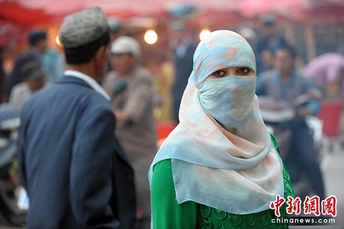 在喀什老城高臺民居,維吾爾族老人、婦女和孩子的臉上和眼睛里透出祥和、安逸;喀什街頭的烤串、馕、水果處處皆是。維族婦女身穿長袍、頭戴紗巾遮面而行,迷人的眼睛顯得十分神秘,在都市形成一道耀眼的風(fēng)景。