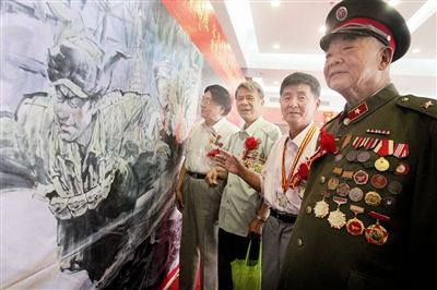 今年是抗美援朝戰(zhàn)爭(zhēng)60周年,6月28日至30日,“永遠(yuǎn)崇敬最可愛(ài)的人”書(shū)畫(huà)展在北京舉行,在京的部分上將、中將、抗美援朝老戰(zhàn)士、北京時(shí)代金城書(shū)畫(huà)院的100名藝術(shù)家參觀了展覽。