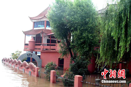20日,中新社記者來(lái)到九江縣江新洲渡口,江邊上的一座剛奠基不到半年的三圣寺已經(jīng)被洪水浸泡,奔涌的長(zhǎng)江水正滾滾東逝,江面上穿梭著幾艘航船,渡口邊一艘渡船上走下上百名乘客,秩序井然。