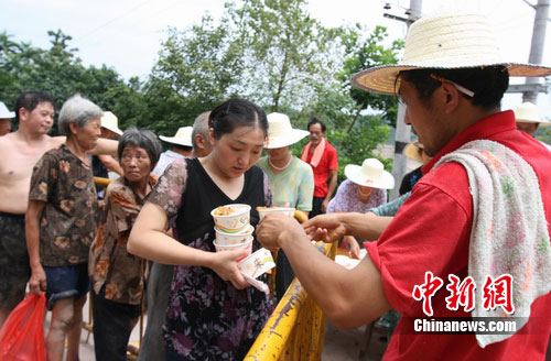 中新網(wǎng)廣安7月22日電( 廖小兵 劉長(zhǎng)河)在剛剛遭受160年未遇的特大洪災(zāi)中,四川省廣安區(qū)肖溪鎮(zhèn)老街被整體淹滅,街道清淤還未結(jié)束,1000余人無家可歸。目前災(zāi)民生活得怎么樣?22日中午12時(shí)許,記者來到肖溪鎮(zhèn)中心街下段的災(zāi)民集中安置點(diǎn),只見兩排帳篷整齊地排列,在第三號(hào)帳篷,災(zāi)民杜超華一家正在吃著香噴噴的盒飯!昂樗畞淼锰土。比三年前的洪災(zāi)高了2米多,我家的東西全部被洪水沖走了。幸虧黨委政府及時(shí)伸出了援手,給我們搭建了帳篷,購置了被褥,免費(fèi)提供一日三餐。晚上還給我們送來了蚊香。盡管受了災(zāi),有了黨委政府的關(guān)愛,我們的家園一定會(huì)迅速重建起來!