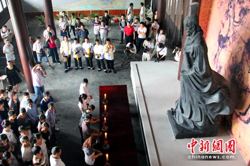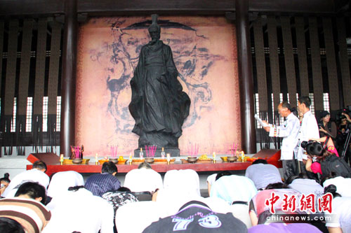 下午15時許,屈氏后裔登上位于鳳凰山頂?shù)拇蟮,那里安奉著從歸州鎮(zhèn)喬遷至此的屈原青銅像。屈氏后裔面對屈原像依次上香、獻(xiàn)祭,并行跪拜叩首大禮長達(dá)十?dāng)?shù)分鐘。