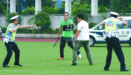15時07分,一輛警車開進操場,8名全副武裝的飛龍突擊隊員跳下車門,迅速包圍操場中央圓弧。他們身穿多功能戰(zhàn)術背心,頭戴防彈頭盔,手握沖鋒槍,大腿外側(cè)還佩戴著手槍!胺畔聝雌鳌,一名突擊隊員通過擴音設備兩次喊話,但兩名持刀男子拒不就擒。