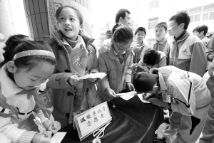 昨天,在中關(guān)村一小校園內(nèi)有六七個(gè)小分隊(duì)擺攤招募志愿者,除了系鞋帶外,潔廁、護(hù)綠、安全、節(jié)水節(jié)電、社區(qū)服務(wù)等都是志愿者分隊(duì)的服務(wù)內(nèi)容!跋M麑W(xué)生把‘志愿’意識(shí)融入生活,形成新的生活方式。”該學(xué)校有關(guān)負(fù)責(zé)人介紹說(shuō),新學(xué)期學(xué)校將實(shí)行志愿者注冊(cè),為學(xué)生配發(fā)志愿者證。學(xué)生志愿服務(wù)的內(nèi)容和時(shí)間、參加培訓(xùn)的經(jīng)歷、獲得的榮譽(yù)稱號(hào)、志愿活動(dòng)的證明人等都會(huì)詳細(xì)記錄在上面。學(xué)生參與志愿服務(wù)的時(shí)間每學(xué)期不得低于50個(gè)小時(shí),中高年級(jí)學(xué)生還將參加校外的社區(qū)服務(wù)活動(dòng)。晨報(bào)記者 李木易/攝