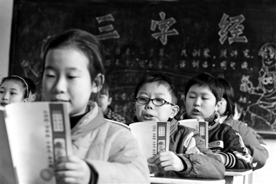 小學(xué)部教務(wù)主任翟振紅介紹,去年9月起,學(xué)校開(kāi)設(shè)了校本課程《中華情——經(jīng)典誦讀》。6本國(guó)學(xué)經(jīng)典包括《三字經(jīng)》、《老子》、《弟子規(guī)》、《論語(yǔ)》、《大學(xué)》、《中庸》,共計(jì)3萬(wàn)字,由學(xué)校出資復(fù)印成材料發(fā)給學(xué)生。