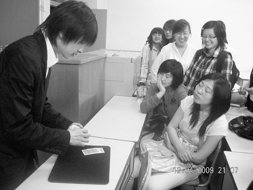 和所有師范學(xué)校一樣,首師大的女生人數(shù)遠(yuǎn)遠(yuǎn)多于男生,魔術(shù)社也不例外。“其實(shí),女生玩魔術(shù)可帥了!今年港澳臺(tái)和內(nèi)地大學(xué)生魔術(shù)交流大會(huì)獲金獎(jiǎng)的就是一個(gè)女生。”女社員吳娟說(shuō),有時(shí)社團(tuán)搞活動(dòng),男生反而成了“珍稀動(dòng)物”。