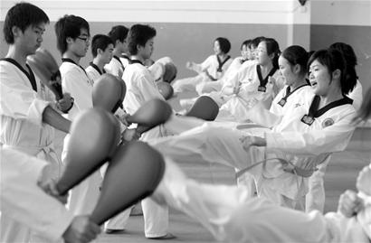 “嚯!哈!……”大學(xué)生會(huì)員們隨著口令,整齊劃一地踢腿。在一片白色的跆拳道服中,活躍的女生身影尤其顯眼,踢腿齊吼時(shí),音量雖趕不上男生,氣勢(shì)卻不輸給他們。跆拳道俱樂部學(xué)生負(fù)責(zé)人楊城介紹,在400多人的注冊(cè)會(huì)員中,女生人數(shù)比男生還要多。