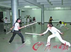 本報(bào)訊 (記者盧迎新 實(shí)習(xí)生 李婷婷攝影報(bào)道)暨南大學(xué)有個(gè)短兵協(xié)會(huì),每周的周二、周四、周日晚上,會(huì)員們都集中練習(xí)。這種對(duì)抗性強(qiáng)的運(yùn)動(dòng)受到在校博士碩士們的熱捧,尤其吸引了一些平日里斯文纖弱的女博士加入,她們表示:“就算被打也很爽快,認(rèn)為是一種時(shí)尚。”