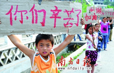去年“5·12”大地震后,徐廣高舉著寫有“你們辛苦了”字樣的感恩牌向路過的救災(zāi)隊伍致謝,此事被眾多媒體報道后,人們稱他為“舉牌娃娃”。 2008年6月6日,徐廣和其他130多名來自青川馬鹿鄉(xiāng)小學(xué)的同學(xué)開始了在東莞的復(fù)學(xué)之旅,他們被分別安排在博雅外國語學(xué)校和石碣的勤徑小學(xué)就讀,所在班級被命名為“汶川班”,而這學(xué)期他們都選擇了返鄉(xiāng)復(fù)課,班級的名字是別有深意的“川莞班”。