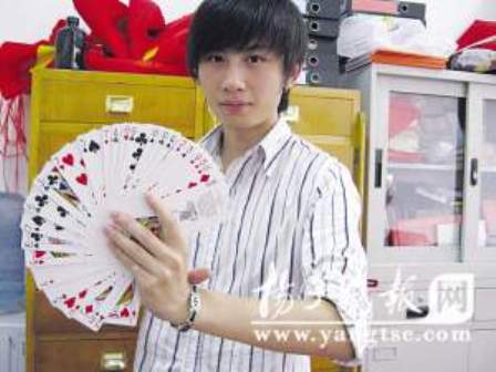 小王介紹,自己學魔術(shù)已經(jīng)有5年歷史。高三時,一次朋友生日聚會上,有人表演了撲克牌魔術(shù),深深吸引了他,沒有人教,他便利用課余時間從網(wǎng)上下載魔術(shù)視頻自學。此后又拜訪了不少老師,技藝不斷提高。在5月27日結(jié)束的江蘇省魔術(shù)大賽上,小王表演的“神筆馬良”,用一支普通的簽字筆在畫板上畫了一朵花兒,手一揮,畫板上的花兒不見了,出現(xiàn)了一朵真花兒;手再一揮,真花兒不見了,又變回了原來畫的花兒,憑借這個魔術(shù),小王獲得大學生組冠軍。