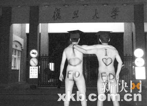 昨日,一條名為《復(fù)旦學(xué)生裸奔慶祝畢業(yè)》的圖文帖,火遍貓撲、天涯、華聲、網(wǎng)易等論壇。在貼出的圖片中,兩名男生頭戴學(xué)士帽,裸體在復(fù)旦校園內(nèi)奔走,并在學(xué)校大門、校訓(xùn)等多個地方留影。在網(wǎng)帖中,發(fā)帖者并未對兩名男生作介紹,但從其中一名男生在復(fù)旦的“恒隆物理樓”留影來看,網(wǎng)友們認(rèn)為這兩名男生應(yīng)該是復(fù)旦物理系的畢業(yè)生。