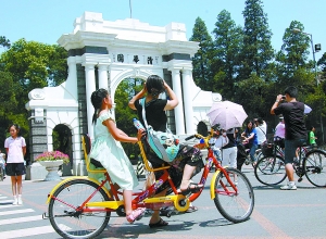 暑假來(lái)清華、北大等首都著名高校旅游的各地游客持續(xù)增加,許多是由學(xué)生與家長(zhǎng)組成的暑期名校游團(tuán)隊(duì)。清華大學(xué)每天接待游客一兩萬(wàn)人,雙休日多達(dá)幾萬(wàn)人。校方為游客增設(shè)了旅游觀(guān)光車(chē)、義務(wù)講解處及24小時(shí)自行車(chē)租賃等業(yè)務(wù),提供便利的人性化服務(wù)。 本報(bào)特約攝影 李文明 RJ136