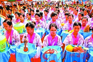 昨天的開幕式中最震撼人心是今年新排演的“七夕典禮”。在典雅的古禮樂聲中, 70名紅幡旗手、21名手持高香的巧姐、56位捧著瓜果、乞巧微型工藝品的巧女、1名德高望重的珠村父老、8名陪祭人和12名即將成年女子身著傳統(tǒng)漢服依次上場(chǎng),200多名祭祀表演者佇立場(chǎng)內(nèi)定席如儀,場(chǎng)面宏大壯觀。