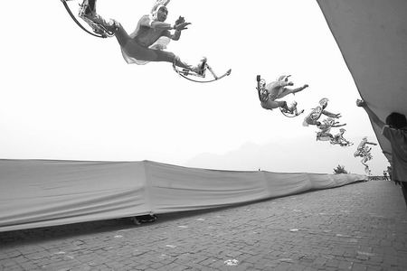 昨天,記者驅(qū)車趕到登封。雖然剛集訓完,在塔溝武校的訓練場上,220名學員仍馬不停蹄地訓練。在一面寬50米、長60米的巨幅國旗下,“彈跳小子”們身輕如燕,姿勢優(yōu)美(如圖)。