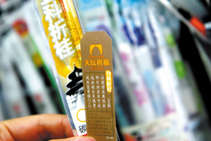 “這款狀元筆買的人很多,大家都希望能高中狀元,上次一個家長就買了10支”。昨天下午,省城長江路上一家文具店內(nèi)店家向顧客介紹。記者抽取了一款外包裝印有“登科折桂”字樣的中性筆筆芯,打開后里面竟然還附帶一張小卡片,卡片上寫有“上上簽”、“天壇祈!钡却蠹罄恼Z句(如圖)。店家王女士告訴記者,這種“討彩”文具是今年才大量出現(xiàn)的,賣得非常好,有的學(xué)生和家長還專門前來購買!捌鋵嵈蠹乙捕际欠N心理暗示,圖個吉利,商家正好抓住了消費者的心理”王女士說。