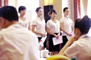 昨天上午7時(shí)許,記者在現(xiàn)場(chǎng)見到,雖然招聘還沒正式開始,考生們已經(jīng)都背起了英文單詞。據(jù)悉,該航空公司將在全國(guó)海選300名空乘,重慶是這次招聘的第二站。上午8時(shí)許,初試正式開始,記者在現(xiàn)場(chǎng)看到,這次招聘體檢很嚴(yán)格,除了基礎(chǔ)的五官體形檢查外,醫(yī)生還特別對(duì)應(yīng)考者腋下的體味進(jìn)行嗅聞,不合格者直接淘汰。