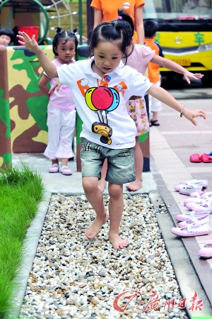 在園方的安排下,一個班的小朋友演示了晨練的過程,過“梅花樁”、“吊臂橫桿”,除了個別小朋友能一氣呵成通過外,絕大多數孩子都需在老師幫助下“過關”。最令現場小朋友覺得“恐怖”的莫過于赤腳走碎石路,大多數孩子都知“痛”而退,但也有個別孩子勇敢地站了上去。據介紹,根據課程安排,冬天還將設立 “寒冷訓練計劃”。