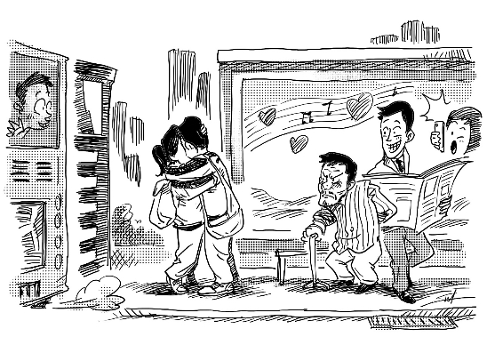 昨天本報(bào)熱線96068接到熱心讀者的來(lái)電,說(shuō)在杭州天目山路八字橋車站每天下午5點(diǎn)半左右,經(jīng)?匆(jiàn)一對(duì)中學(xué)生戀人旁若無(wú)人地?fù)П、接吻,一點(diǎn)也不顧忌周圍人的眼光,公交車來(lái)了也不上車!八麄兠刻於歼@樣,這個(gè)年紀(jì)應(yīng)該學(xué)習(xí)要緊,你們記者去勸勸吧!”