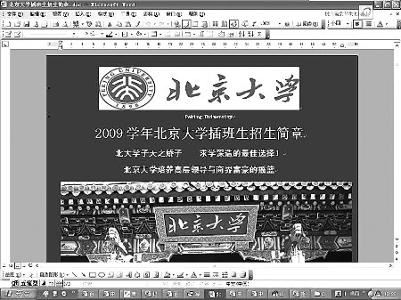 中凰天龍發(fā)來的招生簡章介紹說,北京大學插班生是指跟隨北京大學全日制本科生一塊學習、活動,僅是一次享受北大的文化氛圍,提升自身的知識水平的學習過程,畢業(yè)只頒發(fā)結業(yè)證,不屬于統(tǒng)招范疇。學生擁有聽課證,可以選擇專業(yè)跟讀。除了給招生代理公司交中間服務費外,學生還要向學校交學費7000元 /年、學雜費3000元、床位費500—600元/月等多項費用。