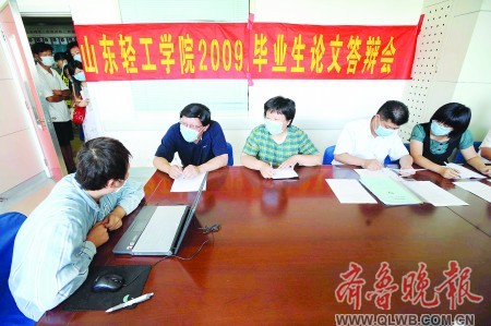 24日上午9點45分,一條標有“山東輕工學(xué)院2009畢業(yè)生論文答辯會”的紅色橫幅掛在山大二院血液科會議室里,山輕工食品與生物工程學(xué)院的五位老師戴著藍色口罩一字排開,坐在一張長條桌的一側(cè)。張萍穿著住院服,戴著口罩在同學(xué)彭愛琴的攙扶下來到會議室。