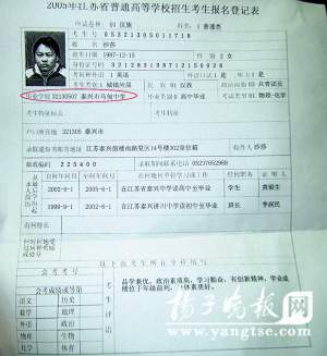 就讀于江蘇教育學(xué)院、今年大四的泰興籍女生沙莎,臨近畢業(yè)時(shí)才驚訝地得知,4年前那份證明她“身份”的《普通高等學(xué)校招生考生報(bào)名登記表》,“篡改”了她的“身世”,畢業(yè)學(xué)校明明是“江蘇省泰興中學(xué)”的她,被寫(xiě)成了“泰興市馬甸中學(xué)”。結(jié)合女兒當(dāng)年高考成績(jī)“很出乎意料”,昨天,擔(dān)心女兒成又一個(gè)“羅彩霞”的沙先生向本報(bào)記者反映,“很可能有人在故意篡改檔案”。