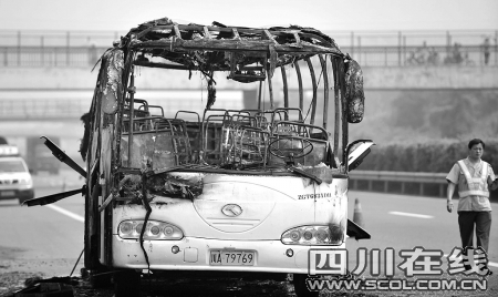 記者在現(xiàn)場(chǎng)看到,事故大巴車(chē)車(chē)身只剩下光架架,在彌漫著焦臭味的車(chē)廂內(nèi),遍布著被燒成灰燼的物品。相關(guān)部門(mén)工作人員忙碌著勘查現(xiàn)場(chǎng)。34名學(xué)生站在高速路邊,他們臉上、衣服上留著黑色灰塵。