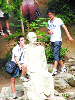 為了留下記憶,很多游客爭(zhēng)相和校園內(nèi)的雕塑合影!鞍沧痹诤商烈唤堑摹爸熳郧逑壬狈浅J芮嗖A。有的游客和“老先生”勾肩搭背,更有甚者,直接坐在“老先生”腿上照相。