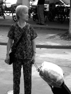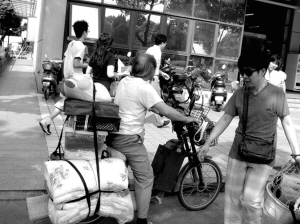 爺爺輩的送新族——一位頭發(fā)花白的老者騎著一輛電動車,車后綁滿了大大小小的包裹、箱子。一個女孩皺著眉頭對老者抱怨著什么。原來,女孩因?yàn)楦改笡]能陪同前來非常生氣,她向老人埋怨說,別人都有父母代辦手續(xù),而自己必須獨(dú)自排隊(duì)繳費(fèi)。老人的銀發(fā)在風(fēng)中顯得零亂,額頭上滲出的汗珠在秋日的陽光里閃閃發(fā)亮。
