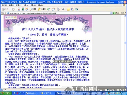 記者在QQ上與“南寧講師懸賞征婚”打招呼后,對方向記者做了說明,他是在替他同學(即“南寧講師懸賞征婚”)掛著Q。當記者向其表明來意之后,對方告訴記者,他同學太低調,太謹小慎微。事實上他也知道,如果廣西和南寧市的媒體一介入,其實就是一種很好的宣傳,這樣他同學能找到好姑娘的把握會更大些。