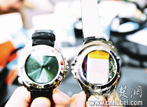 “竅門在這里!惫ど倘藛T把手表后蓋揭開,里面多了一塊微型電路板和芯片。原來,這是一套短信接收裝置,收到短信后,還可以存儲(chǔ)在手表中。