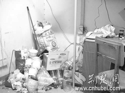 據(jù)記者了解,B棟所住的均為該校的男大學(xué)生。這行粉筆字寫在樓道的地上,記者趕到時(shí),字跡已經(jīng)十分模糊了。在知情學(xué)生的指引下,記者進(jìn)入6樓一間寢室。一進(jìn)門,一陣怪味就撲面而來。四下仔細(xì)一看,寢室門后一個(gè)高近一米的垃圾堆赫然出現(xiàn)在記者眼前:用過的飯盒、塑料袋,甚至是煙頭、飲料瓶,各式垃圾堆滿一地。但在這種環(huán)境下,寢室里的4個(gè)男生卻好像絲毫沒有察覺,上網(wǎng)、看書不亦樂乎。該寢室學(xué)生小程告訴記者,他們每天的學(xué)習(xí)任務(wù)都比較重,課余時(shí)間一些同學(xué)又流連網(wǎng)絡(luò),因此大家平時(shí)都不愿意做清潔,寢室里形成這么個(gè)垃圾堆也“不足為奇”!安贿^通常我們隔一個(gè)月會清除一次的!毙〕陶f,冬天把垃圾堆在寢室里也沒多大關(guān)系,夏天會清除得比較及時(shí)。而小程所說的“清除”,就是把垃圾從室內(nèi)掃到寢室門口堆放,等宿管做清潔的時(shí)候一并清理!捌鋵(shí)我們的生活垃圾是應(yīng)該自己拿到樓下的垃圾桶里扔掉的,但很多同學(xué)為了省事,就直接把垃圾堆在門口,這樣增加了宿管做清潔的勞動量,最后才發(fā)生了她們寫‘大字’抱怨的事情!