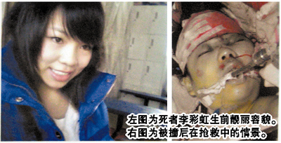 去年12月26日凌晨,湖南打工妹李彩虹離開(kāi)工作的酒店返回宿舍,誰(shuí)料走到花都區(qū)新華街與商業(yè)大道的交叉口時(shí),一輛紅色寶馬Mini小轎車(chē)飛馳而過(guò),將她撞死。駕車(chē)人是廣東外語(yǔ)外貿(mào)大學(xué)大三學(xué)生任偉煒。兩人是同齡人,當(dāng)時(shí)都只有21歲。肇事者任偉煒當(dāng)即駕車(chē)逃逸,至今未歸案。