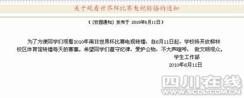 西財在校學生小徐在本報大成網(wǎng)新聞報料臺轉(zhuǎn)發(fā)了這則通知:“2010年南非世界杯開幕在即,世界杯比賽期間正值國家英語四六級考試和期末復習考試階段,為了維護學校的正常教學和生活秩序,確保同學們能夠正常的休息,以良好的狀態(tài)溫課迎考,應廣大同學和學生家長的要求,學校決定自6月11日起至賽事結(jié)束,學生公寓熄燈以后校園網(wǎng)絡也將暫停使用。”