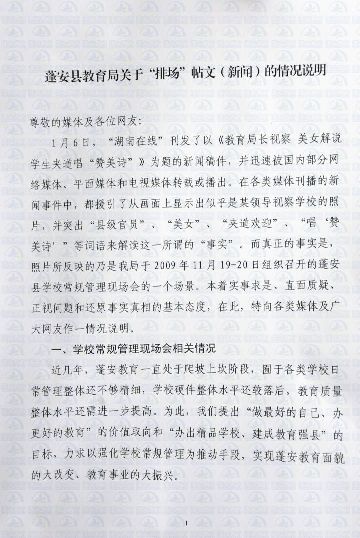 蓬安縣教育局今日在其官方網(wǎng)站刊發(fā)《蓬安縣教育局關(guān)于“排場(chǎng)”帖文(新聞)的情況說(shuō)明》。