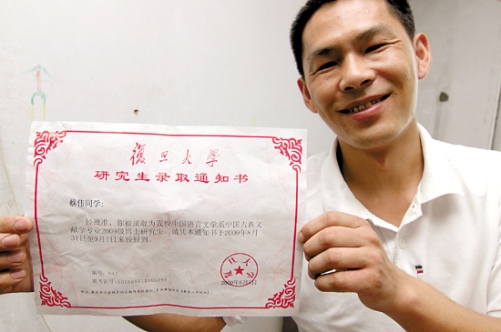 近日,遼寧錦州市下崗職工、三輪車夫蔡偉被錄取為復(fù)旦大學(xué)中國語言文學(xué)系中國古典文獻(xiàn)專業(yè)2009級(jí)博士研究生。蔡偉僅有高中學(xué)歷,但他對(duì)古文獻(xiàn)研究,尤其對(duì)傳世文獻(xiàn)和出土文獻(xiàn)研究情有獨(dú)鐘,在工作之余刻苦自學(xué),終于“修成正果”,夢(mèng)想成真。昨日,蔡偉展示復(fù)旦大學(xué)研究生錄取通知書。