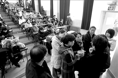 與往年一樣,今年中傳大仍推行網(wǎng)上報(bào)名,藝術(shù)類專業(yè)全部實(shí)行網(wǎng)上報(bào)名、網(wǎng)上交費(fèi)、網(wǎng)上約考。由于很多考生反映未報(bào)上名,學(xué)校特意在2月7日安排人員為考生現(xiàn)場補(bǔ)報(bào),但部分考生仍未能趕上這次補(bǔ)報(bào)。為給考生考試機(jī)會(huì),昨天上午,學(xué)校在教務(wù)處臨時(shí)設(shè)置了一個(gè)報(bào)名點(diǎn),方便學(xué)生補(bǔ)報(bào)。