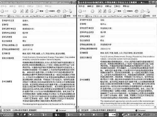 昨天(25日,下同)下午,記者按照這名網(wǎng)友提供的信息,登錄中國(guó)知網(wǎng),分別下載了這兩篇碩士論文。