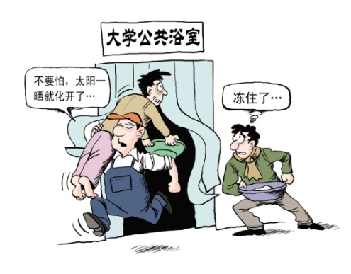 本月21日,在汕頭金山中學南校就讀高二的小丹回市區(qū)度周末,一回到家中,她就迫不及待地沖進浴室,痛痛快快地洗了個真正意義上的熱水澡,學校里那半冷不熱的水讓她實在難以忍受。在幾天前最寒冷的那一天,小丹和同學們在公共澡房內刷卡等了半天,卻盛了一桶冷水,后來聽說是因為天氣太冷,供水管里的水都讓凍得幾乎結冰,水龍頭里流出來的都是冷水。沒辦法,小丹只好到開水房裝了一壺開水,摻進桶里混成溫水,打著哆嗦勉強洗完澡。